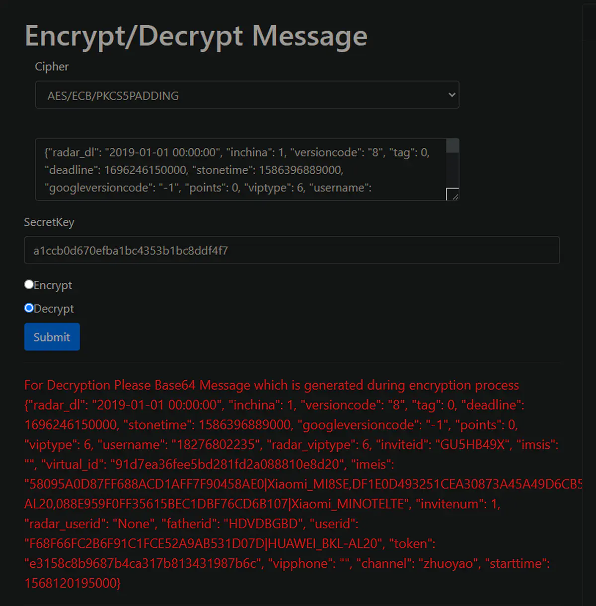 data值为使用AES-ECB-PK5加密的数据,data值解开后为形如以下结构的字符串(注意为字符串):
