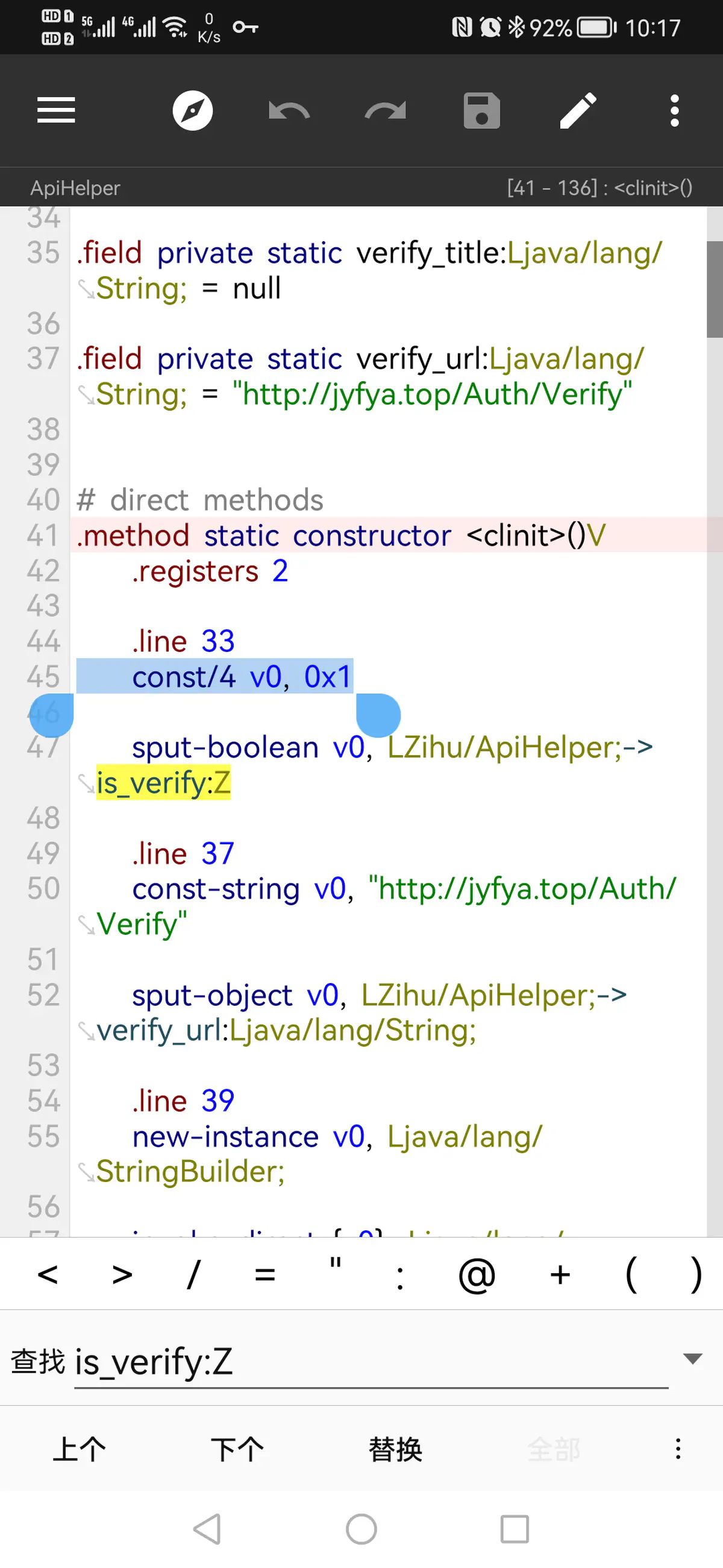 在smali码里找到第45行,将const/4 v0,0x0改为const/4 v0,0x1