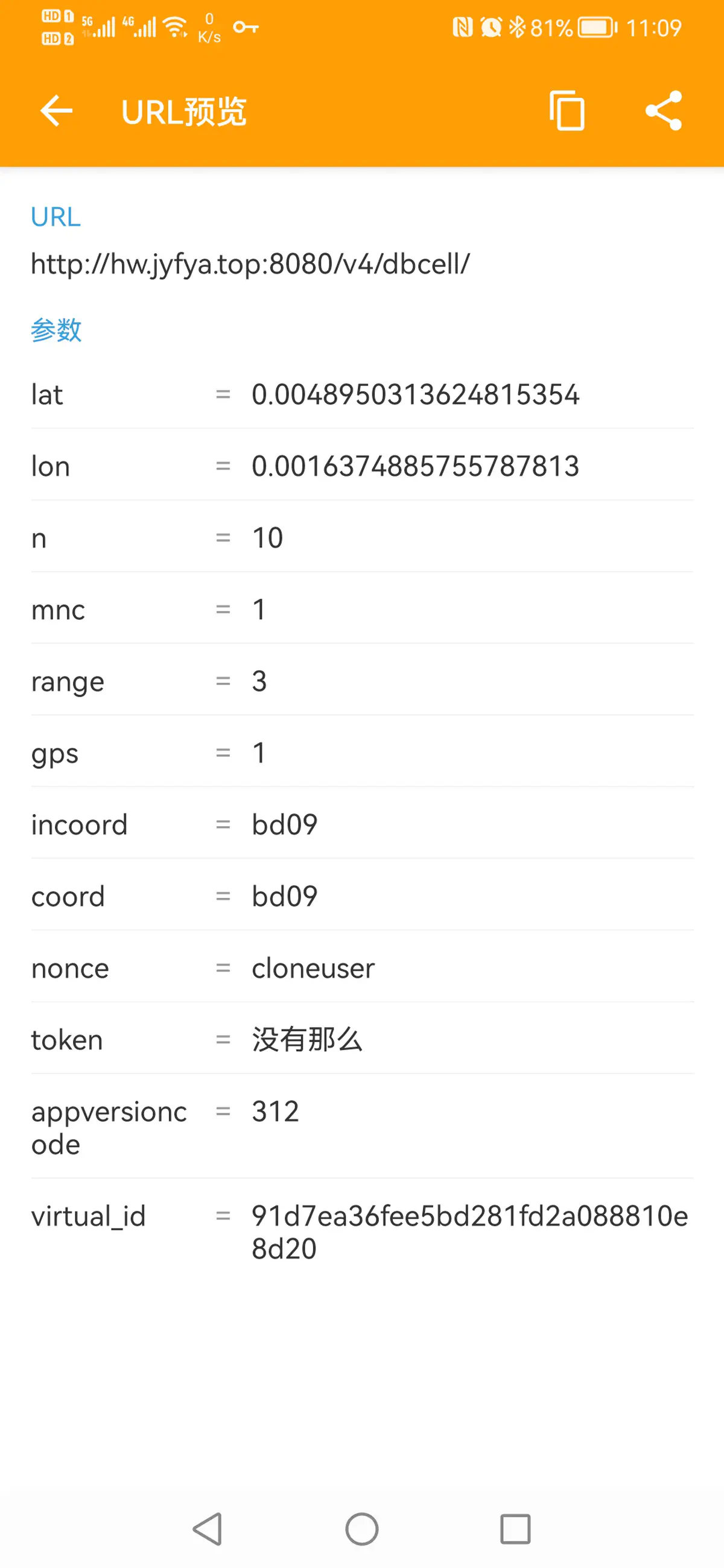 请求URL:http://hw.jyfya.top:8080/v4/dbcell/?lat=28.288195462671396&lon=112.9000414965204&n=10&mnc=1&range=2&gps=1&incoord=bd09&coord=bd09&nonce=cloneuser&token=6699666&appversioncode=312&virtual_id=91d7ea36fee5bd281fd2a088810e8d20