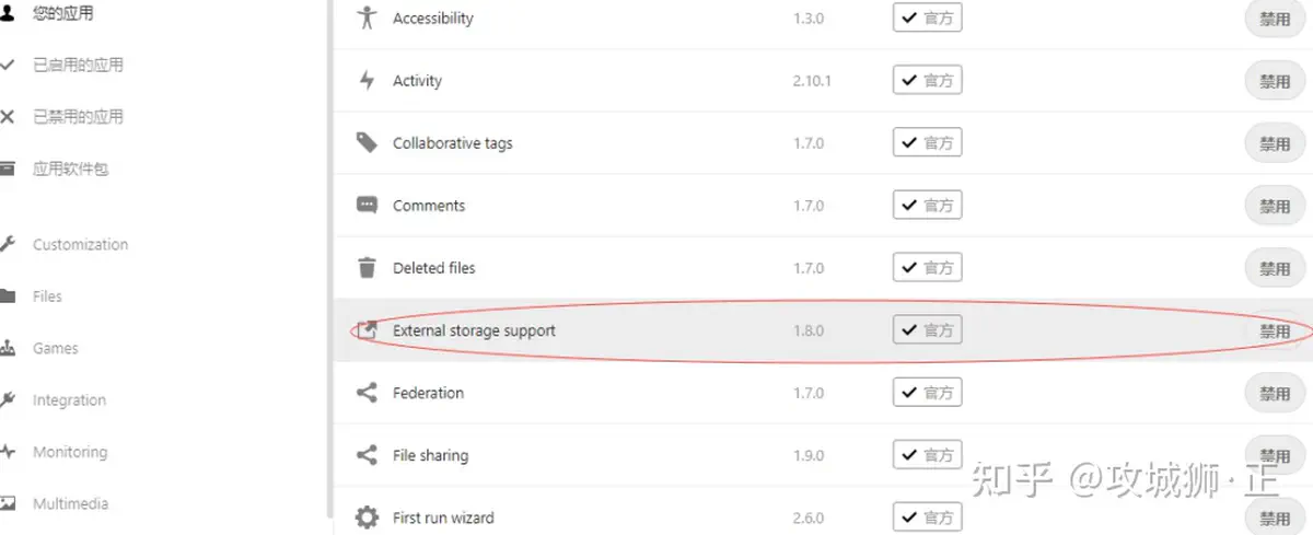 Nextcloud默认是没有开启外部存储功能的,需在手动启用插件。