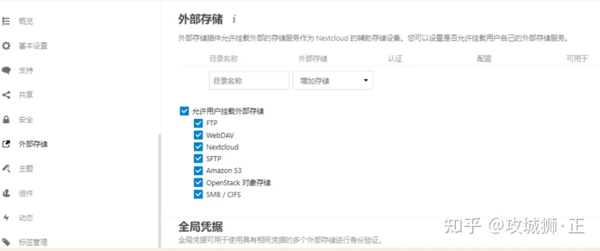 Nextcloud 不仅是一个私有网盘,它还支持管理其他外部存储。可以把Samba共享,FTP,WebDAV等挂载到目录下统一访问管理。