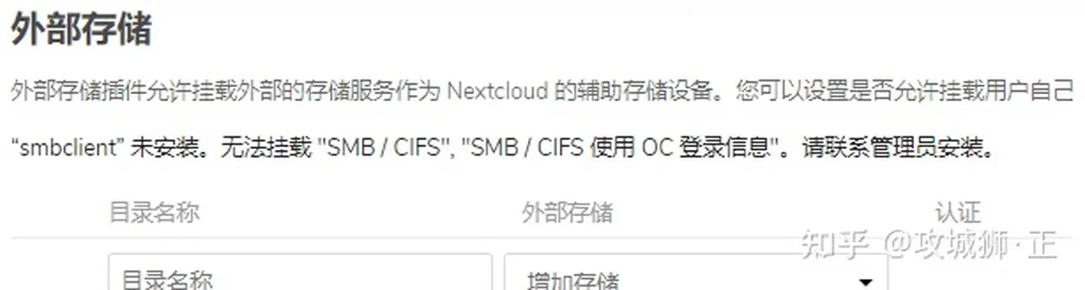 Docker部署的 Nextcloud 默认是无法挂载 Samba 的,这里会显示: