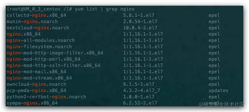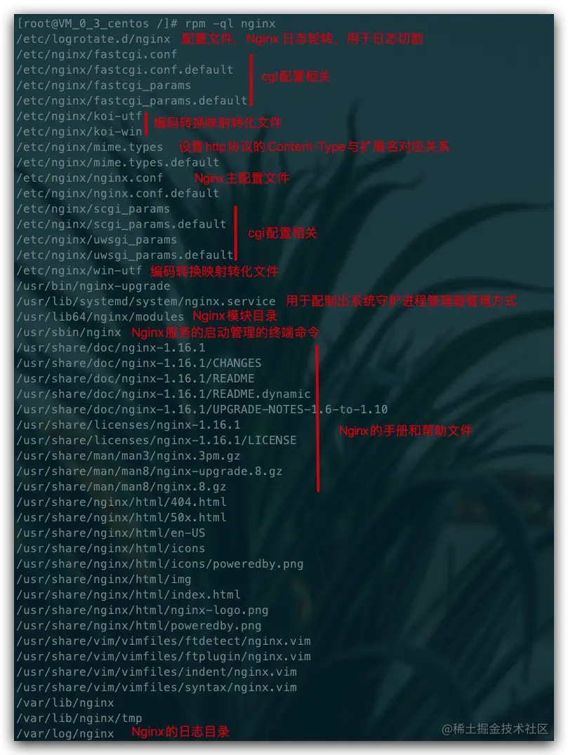 然后我们可以使用 rpm -ql nginx 来查看 Nginx 被安装到了什么地方,有哪些相关目录,其中位于 /etc 目录下的主要是配置文件,还有一些文件见下图: