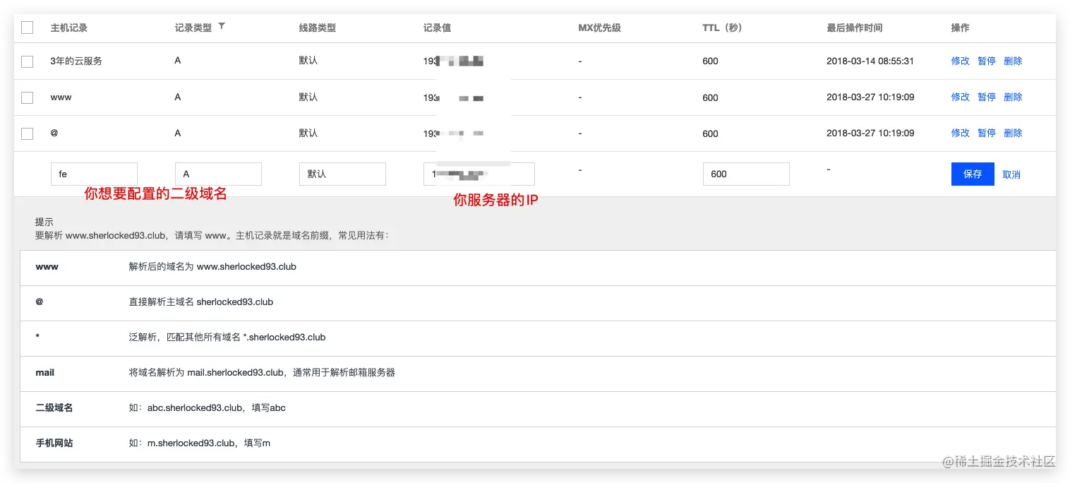 要解决跨域问题,我们来制造一个跨域问题。首先和前面设置二级域名的方式一样,先设置好 fe.sherlocked93.club 和 be.sherlocked93.club 二级域名,都指向本云服务器地址,虽然对应 IP 是一样的,但是在 fe.sherlocked93.club 域名发出的请求访问 be.sherlocked93.club 域名的请求还是跨域了,因为访问的 host 不一致(如果不知道啥原因参见前面跨域的内容)。