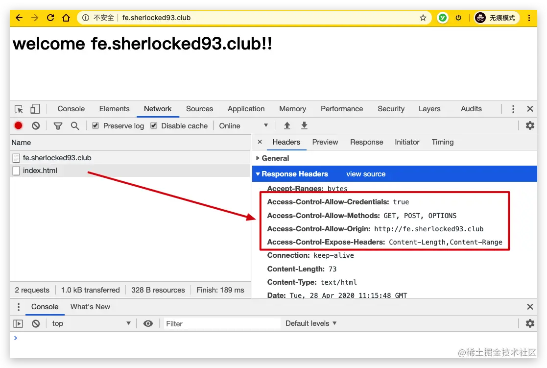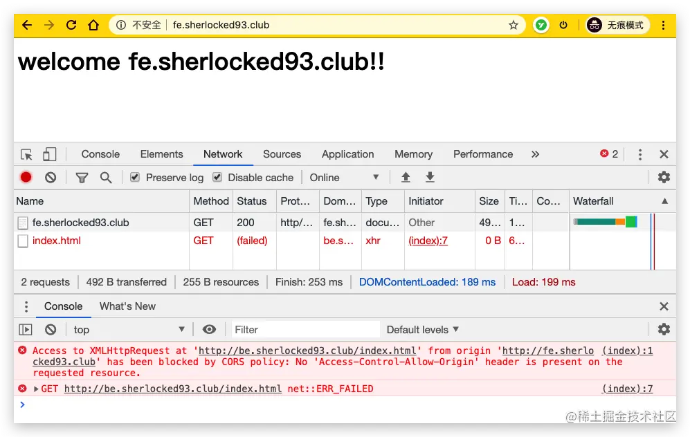很明显这里是跨域请求,在浏览器中直接访问 http://be.sherlocked93.club/index.html 是可以访问到的,但是在 fe.sherlocked93.club 的 html 页面访问就会出现跨域。