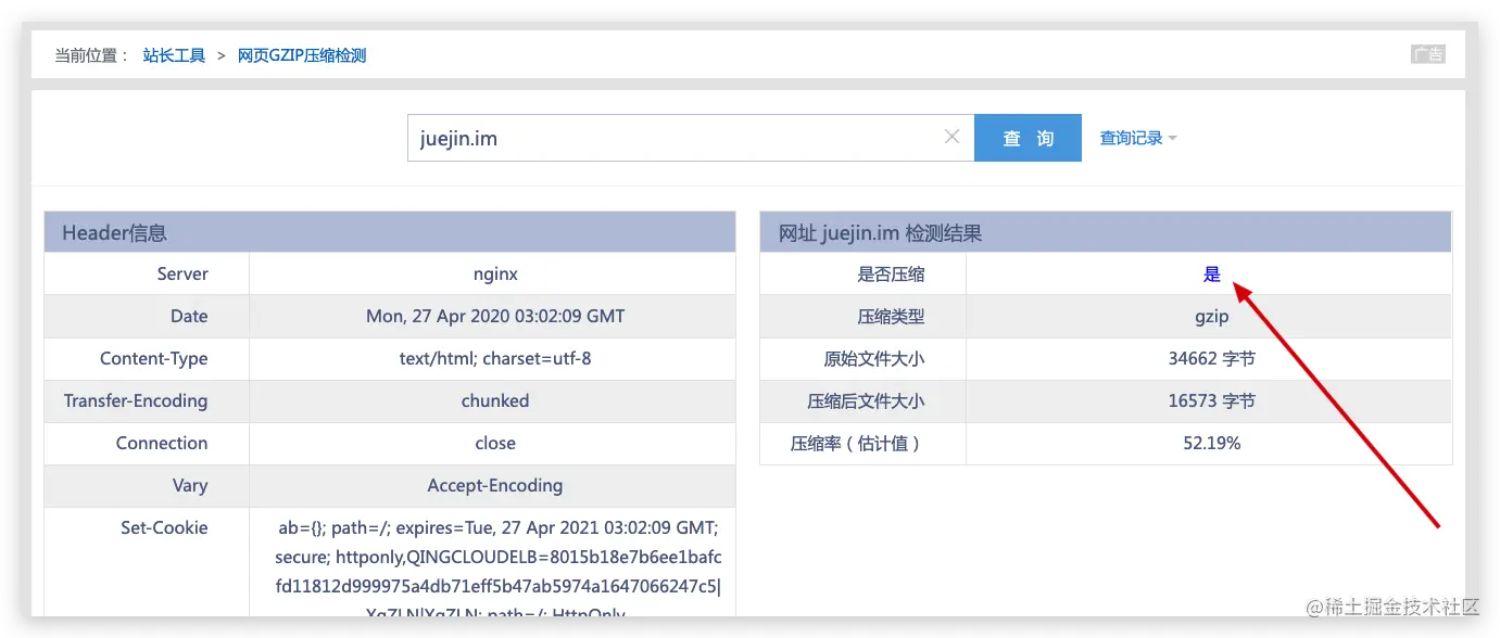 百度可以找到很多检测站点来查看目标网页有没有开启 gzip 压缩,在下随便找了一个 <网页GZIP压缩检测> 输入掘金 juejin.im 来偷窥下掘金有没有开启 gzip。