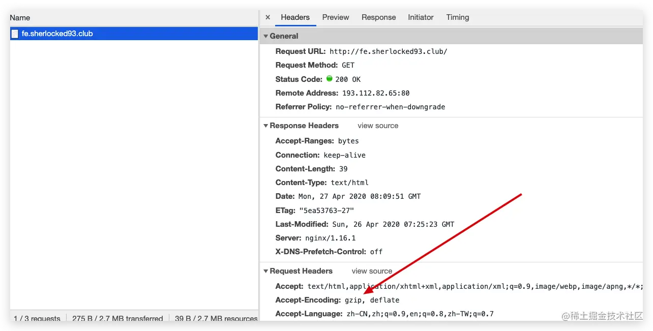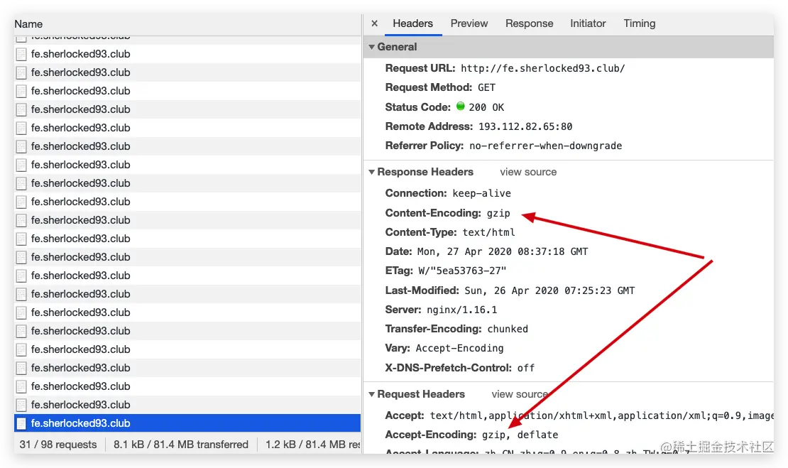 这里可以看到掘金是开启了 gzip 的,压缩效果还挺不错,达到了 52% 之多,本来 34kb 的网页体积,压缩完只需要 16kb,可以想象网页传输速度提升了不少。